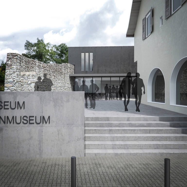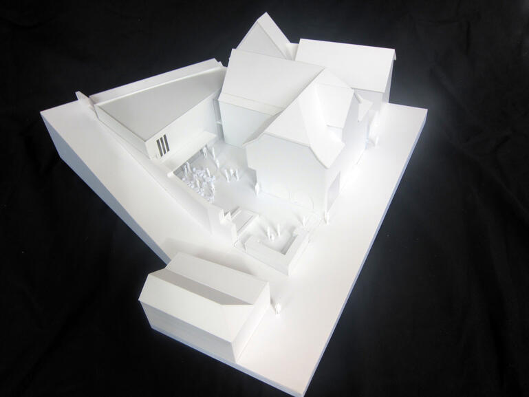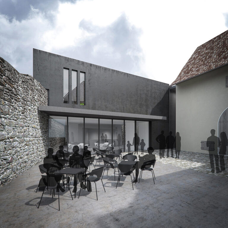 The new building of the city historical museum forms the back end of the yard. The compact two-storey building takes up a volume compared to the historical inventory, but asserts itself through its black pigmented exposed concrete façade as an independent house. The historical monastery wall runs on the ground floor into the building, as the outer border becomes the formative spatial element.
