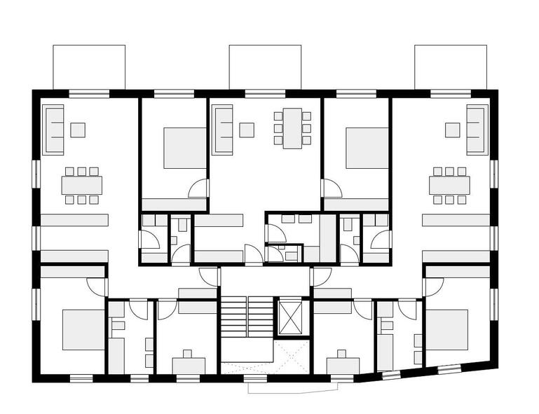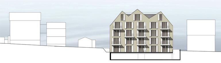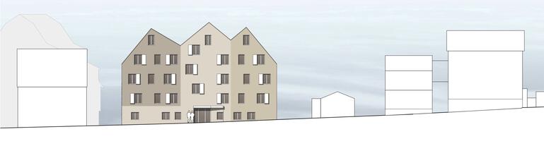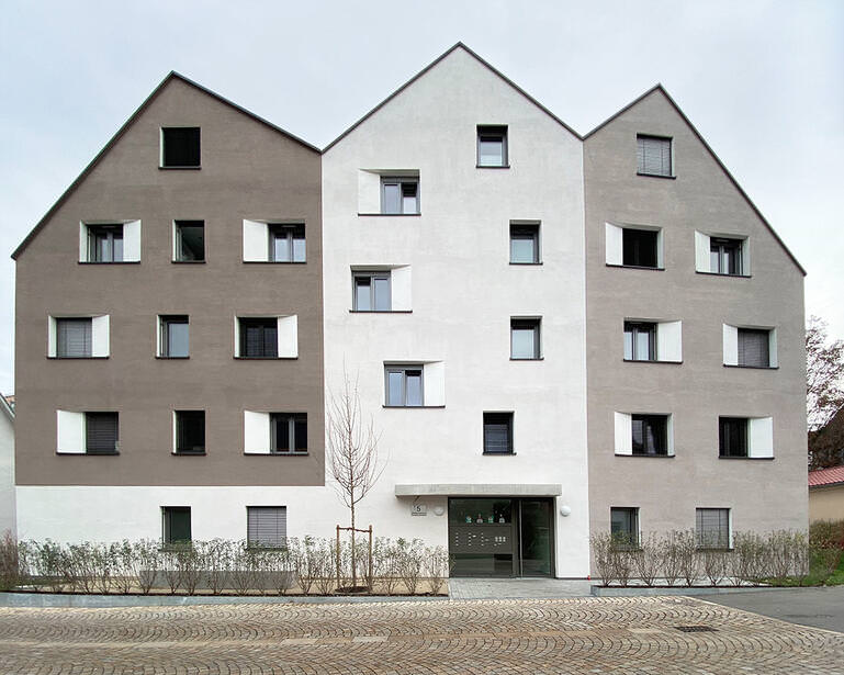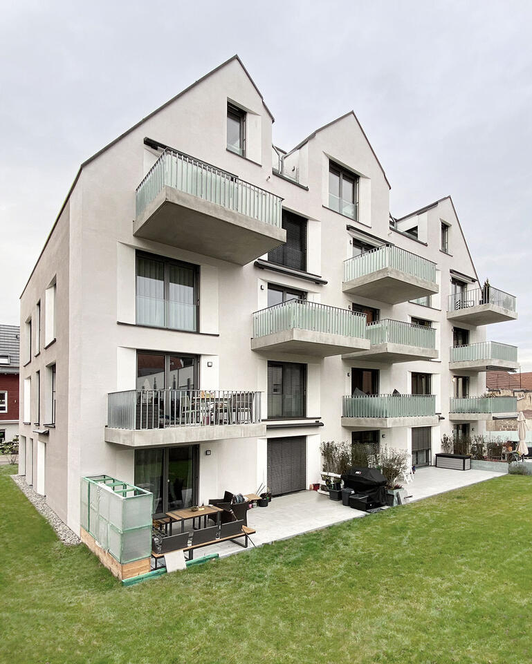 Für eine innerstädtische Nachverdichtung bei Stuttgart entstand ein zeitgemäßer Entwurf der mit dem Bild eines archetypischen Wohnhauses mit Giebeldach spielt. Das Mehrfamilienhaus, eine optische Verschmelzung von drei Gebäuden, präsentiert sich mit einer aufgelockerten Lochfassade zur Straße und öffnet sich rückwärtig zu einem idyllischen Grünbereich. Die monochrome Farbigkeit, bei gleichzeitig subtiler Differenzierung der Materialität fügen das Gebäude trotz seiner Größe in die Massstäblichkeit des gewachsenen Bestandes der Umgebung ein.