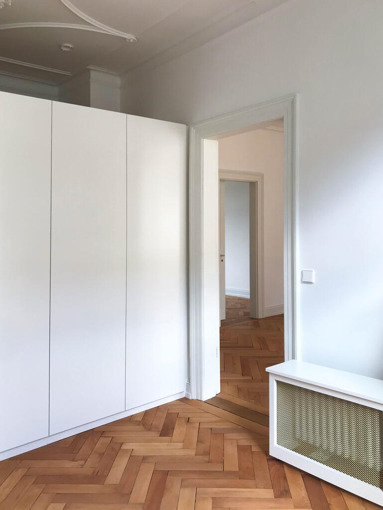 Neuordnung der Raumbezüge in den Bereichen Bad, Küche, Essen / Verlegen des Elektroverteilers und Neuverteilung der Elektroleitungen / Rückbau der Gaseinzelöfen und Einbau einer zentralen Gasetagenheizung sowie neuen Heizkörpern / Neukonfiguration und Vergrößerung des Badgrundrisses und Einbau von Sanitärobjekten / Ertüchtigung des bauzeitlichen Fischgrätparketts / Aufarbeitung von Sockeln, Friesen, Stuck und Lamperien / Herstellung eines Abstellraums / Einbau einer Einbauküche sowie Einbauschränken & Heizkörperbekleidungen.