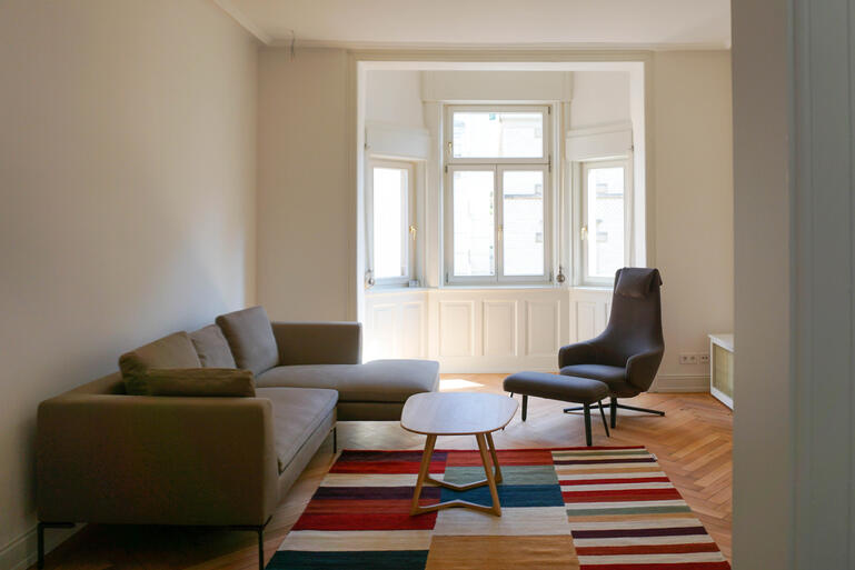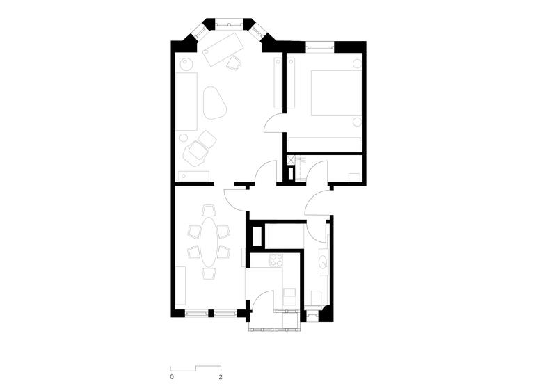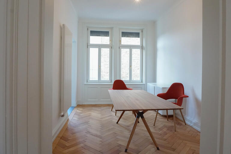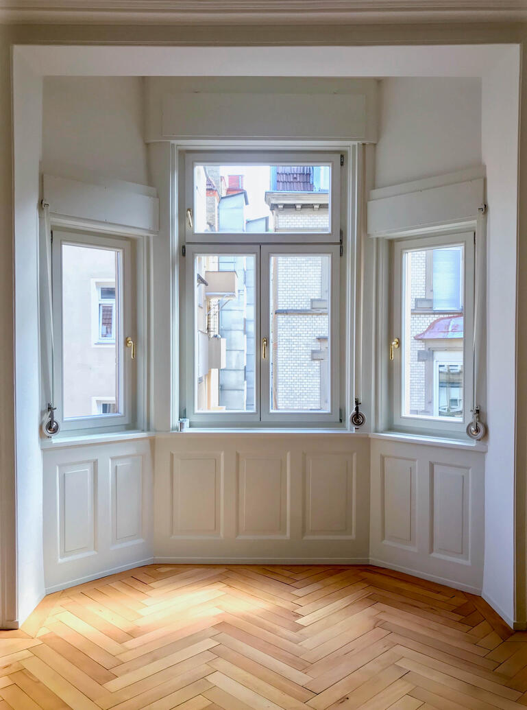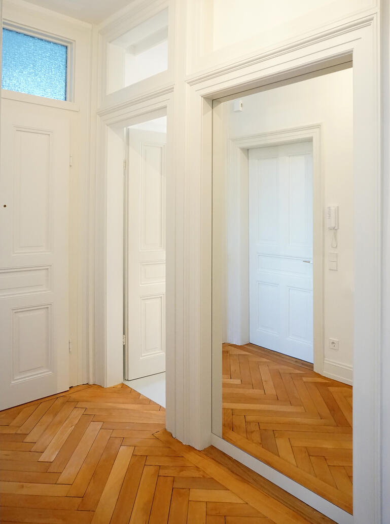 Es steht aufgrund seiner zurückhaltenden Gestaltung und den sehr einfachen Einbauten in sehr archaischer Weise beispielhaft für mittlerweile viele Sanierungskonzepte die unser Büro in den vergangenen Jahren erstellt und ausgeführt hat. Dieses Objekt veranschaulicht daher sehr deutlich, frei von ansonsten oft in unserer Arbeit dominierender Farbgebung oder individuellen Einbauten unsere Haltung in Bezug auf unser gebautes Erbe. Im Bestreben, den Charakter des Bestands so weit wie möglich und sinnvoll zu erhalten, wurden sämtliche bauzeitliche Konstruktionen, Oberflächen und Zierelemente sorgsam aufbereitet und wo notwendig ergänzt. Nichts desto trotz war ein behutsamer Eingriff in die Grundrissorganisation sinnvoll um den zeitgemäßen Bedürfnissen der Eigentümer und Nutzer gerecht zu werden.
