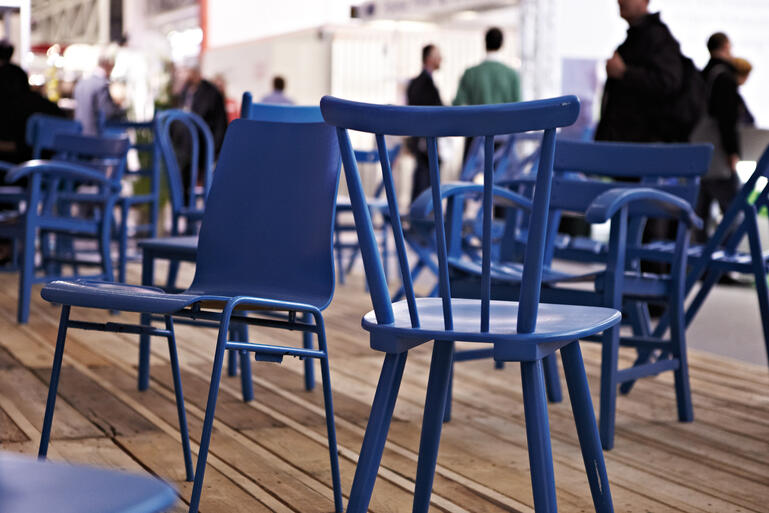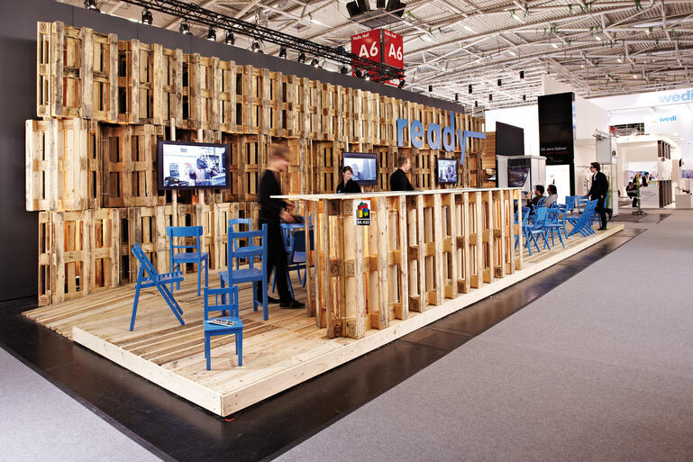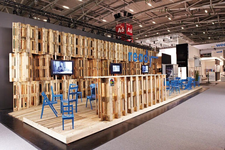 Durch die Reduktion auf ein einziges konstruktives wie gestalterisches Element, die gebrauchte EURO-Palette, entsteht ein prägnantes homogenes Bild, dessen robuster Charakter sich deutlich von den gewohnten Hochglanzoberflächen absetzt. Eine räumliche Struktur aus vertikal angeordneten Dreiecksprismen, die jeweils aus 3 Paletten bestehen, bildet als durchgehende Wand einen starken Rücken. Als Verbindungselement dienen ausschließlich herkömmliche Kabelbinder. Die Paletten werden dabei nicht beschädigt und können nach der Messe regulär weiter genutzt werden. Die Konstruktion setzt damit den Anspruch des Forschungsthemas an eine nachhaltige Planung mustergültig um. Der Boden ist ebenfalls vollständig mit Paletten ausgelegt und wird so zur Plattform, die sich zu 3 Standseiten öffnet und zusammen mit einem Sammelsurium verschiedener, leuchtend blau lackierter Holzstühle großzügig zum Besuch oder einfach nur zum Ausruhen einlädt.