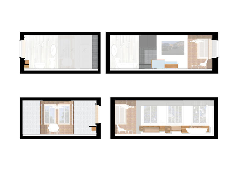 Diese beiden Bereiche, welche nahtlos in den Hauptraum übergehen, werden durch Deckenspiegel betont, die das Refugium zudem insgesamt größer erscheinen lassen. Während der WC- und Duschbereich über einen Vorhang vor einem Glas abgetrennt ist, stehen die übrigen Funktionen in direktem räumlichen Bezug. Scheinbar chaotisch aneinander addierte Schrankelemente fügen sich zu einem raumverbindenden Sideboard, das Stauraum bietet, dann zum Schreibtisch, später zur Bank, dann zur Ablage für Badutensilien wird, um Ordnung zu schaffen.
