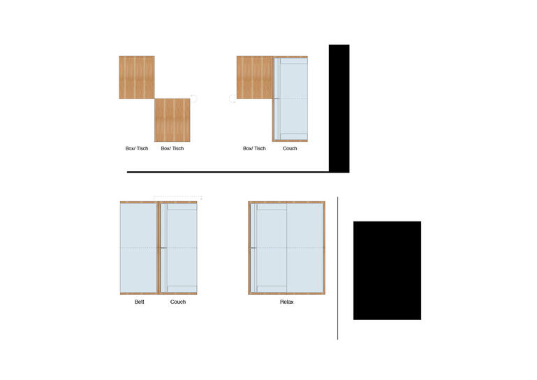 Die Raummitte – als Insel und Mittelpunkt des Geschehens – wird von einem Möbel aus zwei hölzernen Boxen bestimmt. Sie werden vom Tisch zur Couch, von der Couch zum Bett, vom Einzelbett zum Doppelbett.