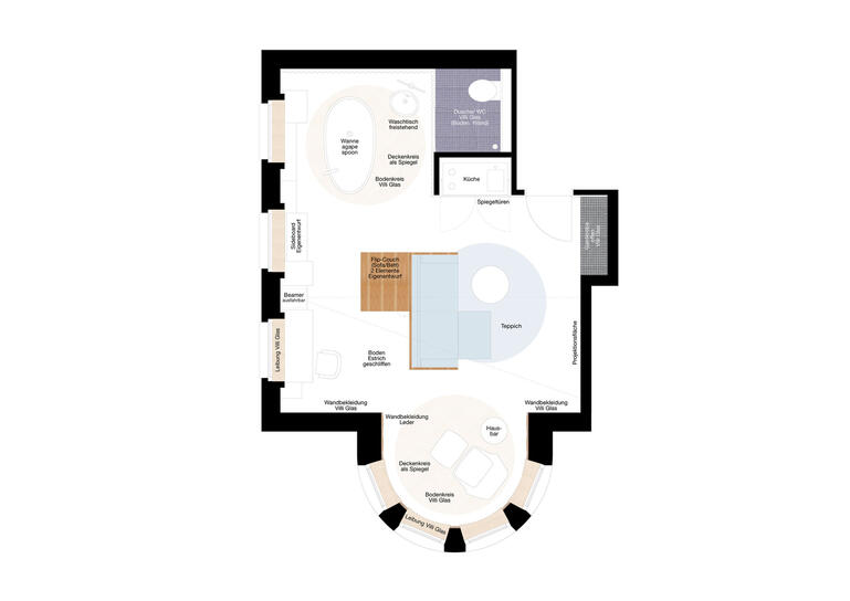 Es wird durch eine raumhoch verspiegelte Eingangswand optisch vergrößert. Der veredelte Estrichboden verleiht ihm einen prozesshaften Charakter und lässt die eingelassenen Mosaikintarsien im Bereich des Erkers und der Badezone entsprechend zur Geltung kommen.