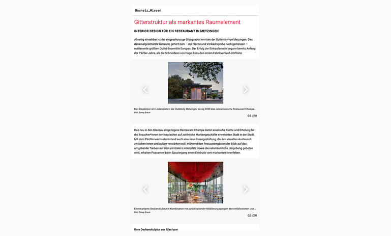 Gitterstruktur als markantes Raumelement: Baunetz Wissen hat unsere Rote Deckenskulptur aus Glasfaser im Champa Restaurant in Metzingen in der Rubrik "Gerüste und Schalungen" vorgestellt.