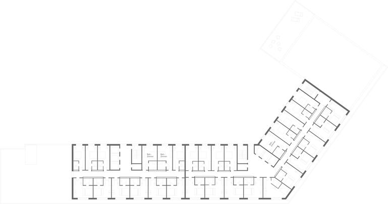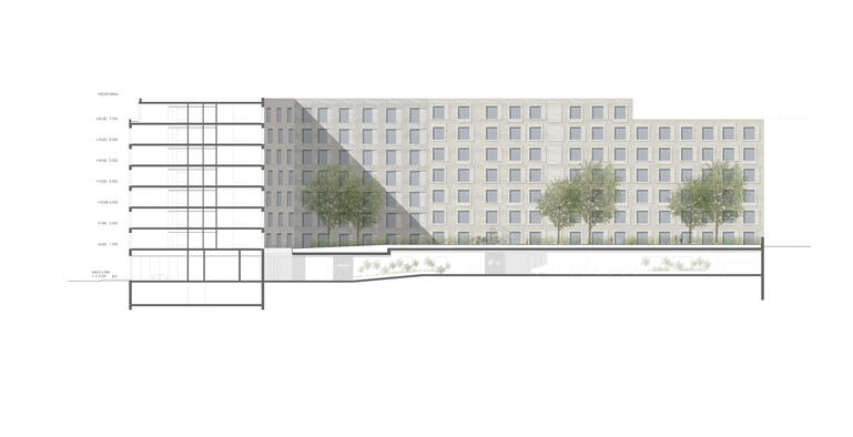 Andererseits ermöglicht die einfache Gliederung der additiv aneinandergereihten Gebäude eine klare Aufteilung der Flurstücke und sorgt damit für klare Eigentumsverhältnisse. Die städtebauliche Anordnung ist zudem weitgehend nutzungsneutral. Das erhöht die Flexibilität sowohl in der Nutzung der Gebäude als auch auf städtebaulicher Ebene und unterstützt damit einen ganzheitlich nachhaltigen Ansatz. Die Staffelung der beiden letzten Obergeschosse ermöglicht eine maximale Grundstücksausnutzung unter angemessener Berücksichtigung der Bestandsbebauung.
