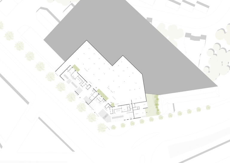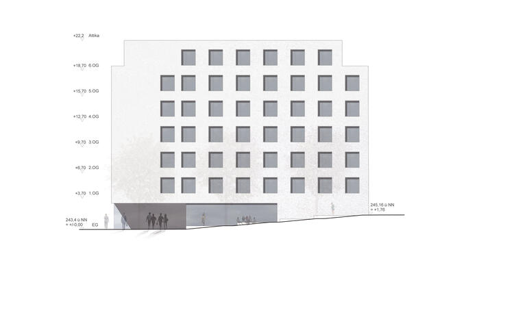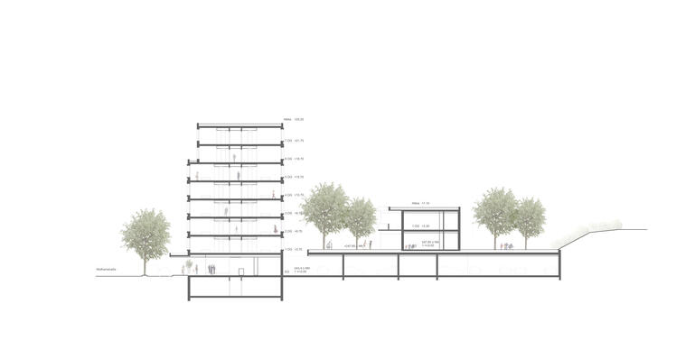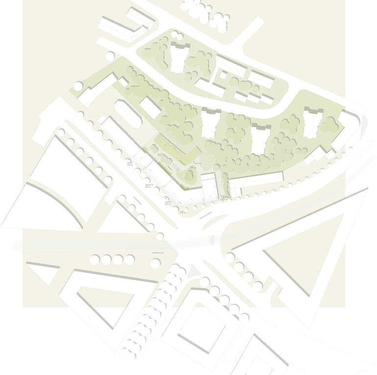 Die Konzentration der Gebäudevolumen entlang des Straßenraums folgt dem städtebaulichen Konzept und stärkt den urbanen Charakter. 6-8 geschossige Gebäude vermitteln zwischen den angrenzenden Nachbarn und der prominenten Ecksituation. Im Gegenzug wird der rückwärtige, nördliche Teil des Baufelds weitestgehend frei gehalten. Hier entsteht ein geschützter durchgrünter Freiraum im Innenbereich, der die topografische Besonderheit des Geländes, eine sehr steile, dicht bewachsene Hangkante, als prägendes Element in die Konzeption integriert. Die Höhendifferenz von mehr als 10 m wird hier durch ein Anheben des Niveaus entschärft. Das Grün des bewaldeten Hangs verbindet sich mit dem Gründeck, in das die Kindertagesstätte als 2-geschossiger Flachbau eingebettet wird, und vermittelt topografisch zwischen der höher gelegenen Bestandsbebauung im Norden und der Neuentwicklung entlang der Straßenkanten. Das angehobene Gründeck überdacht die ebenerdige, gemeinschaftliche Parkierungsanlage und schafft gleichzeitig eine deutlich verbesserte Belichtung für Kita und Freibereich.