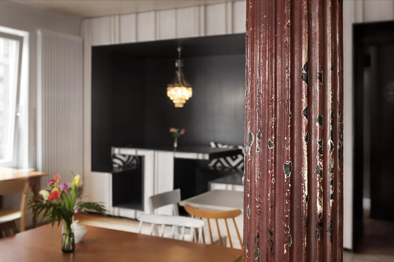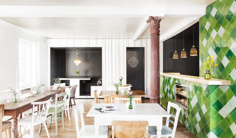 Das Konzept baut nicht auf visueller Gestaltung, sondern auf der Katalysierung von Atmosphäre auf. Dafür sorgen die vielen über hundert Jahre alten Elemente, die den Raum entscheidend prägen. Das alte Parkett wurde geschliffen, die rohe Backsteinwand weiß getüncht, eine Stahlstütze, die frei im Raum steht, trägt ihre alte Patina und erzählt von der Geschichte des Ortes. Traditionell hergestellte Betonfliesen mit einem klaren schwarz-weißen Ornamenten kontrastieren das zurückhaltende Parkett. Dreh- und Angelpunkt des L-förmigen Grundrisses ist die in verschiedenen Grün-Nuancen gehaltene Bar aus diagonal gesetzten Jugendstilfliesen. Eine pechschwarze Sitznische, die wie ein Aufriss der Wand erscheint und über deren Tisch ein feiner Jugendstilkronleuchter hängt, interpretiert den so typischen Stammtisch neu.