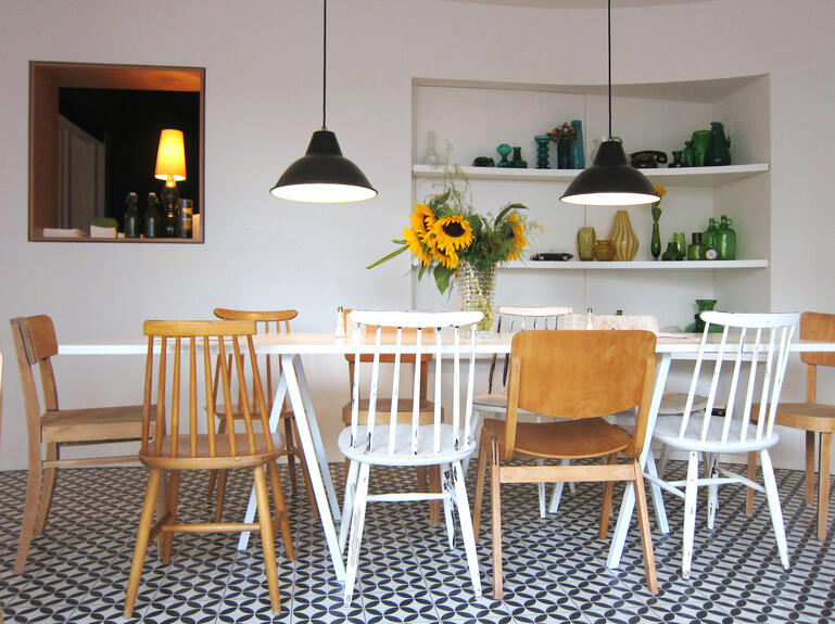 Auch die Entstehung des Projekts zeugt mehr von einem Miteinander als von einer typischen Architektenplanung. Die Konzeption gibt lediglich mit einem unmissverständlichen „Styleguide“ vor, während die Betreiber selbst in enger Rücksprache mit SOMAA die Möbel auf ebay und auf Flohmärkten zusammengetrieben haben.