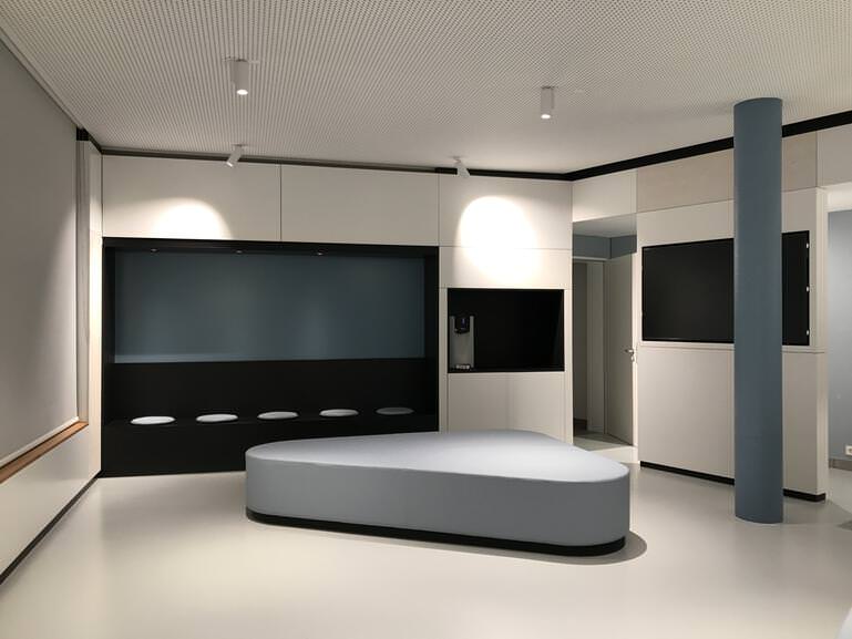 A calm lake with two islands resting in the middle, bordered by a birch forest. This was the conceptual starting point for the design of the new reception area of the Kleintierklinik Ludwigsburg. The architects wanted to create a place that is unmistakably the centre and heart of the now increased amount of employees on forty-seven to be exact. The Kleintierklinik is located on the edge of Ludwigsburg, which lies in the border area between the industrial area and fields. "We need a place for our clients and their owners, which meets our demand for individual care, professional service, and future-oriented thinking," says Dr. Marc Goldhammer, who has been running the clinic together with his wife since 2016.