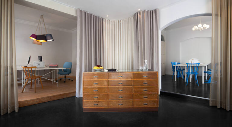 Authentic materials and naturalness characterize the mood. The material selection is essentially limited to oil treated raw steel, leather and brushed larch wood. These materials are accompanied by the hues of the walls between black, blood red and delicate pink. The clear appearance of the room with its archaic furniture contrast with the accent walls of soft pink, playful table top and exciting flea market fundus. Small details like the round leather seat cushion with red seam, that make sitting on the rustic workshop seats comfortable revealing the analysis of every detail, which is also reflected in the kitchen.