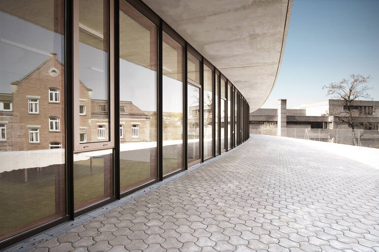 The historical monastery wall runs on the ground floor into the building, as the outer border becomes the formative spatial element.