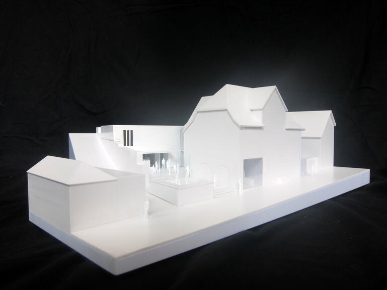 The new building of the city historical museum forms the back end of the yard. The compact two-storey building takes up a volume compared to the historical inventory, but asserts itself through its black pigmented exposed concrete façade as an independent house. The historical monastery wall runs on the ground floor into the building, as the outer border becomes the formative spatial element.