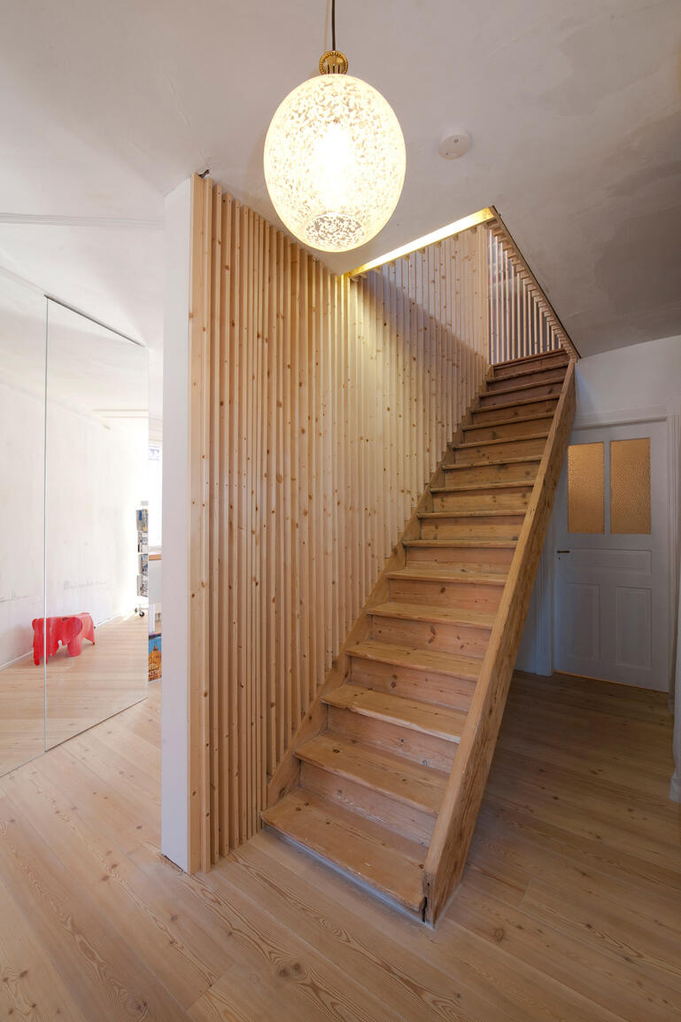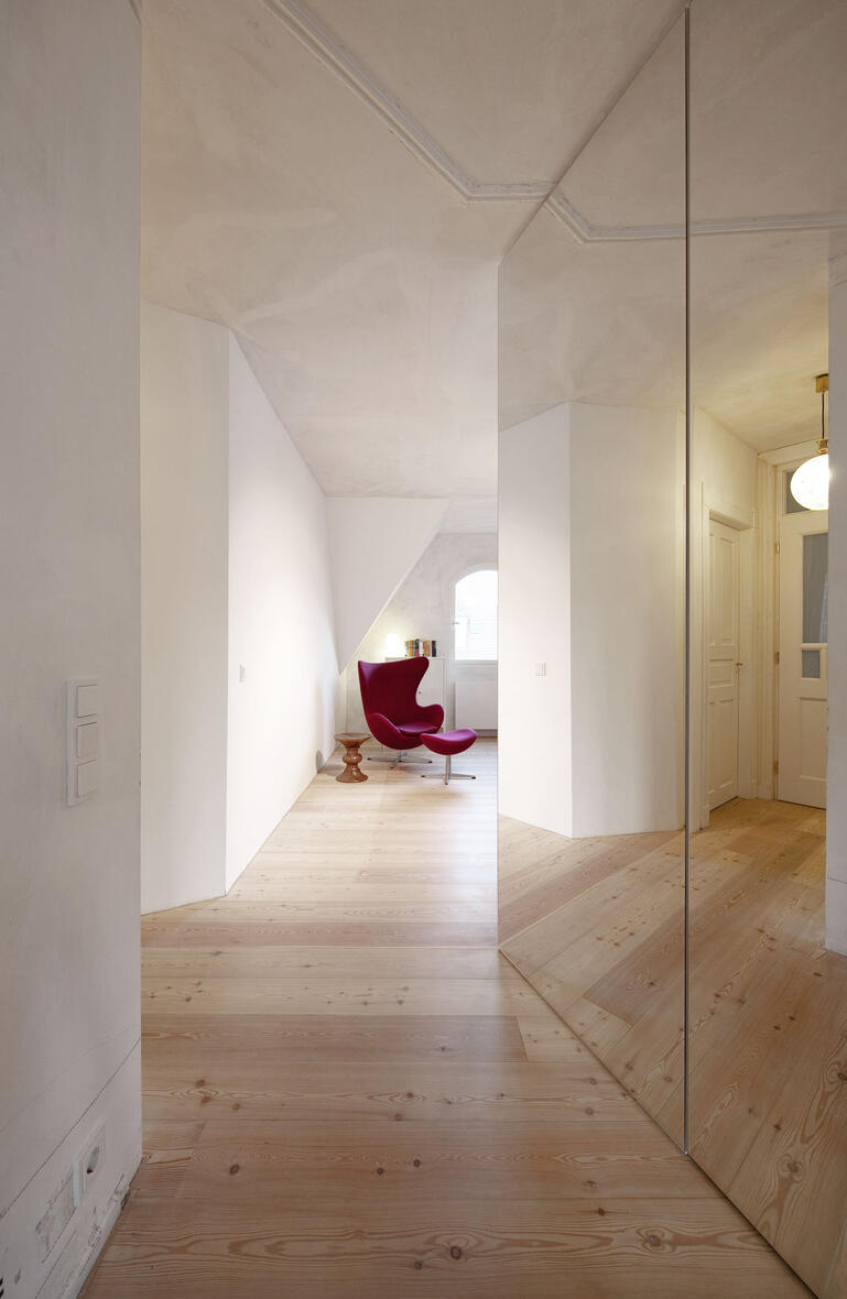 Vor dem Umbau wurde nur die hofseitige Hälfte des Dachgeschosses als kleine Wohnung genutzt, 40 qm ohne angemessene Heizung, ohne Bad. Die straßenseitigen Dienstbotenzimmer standen leer. Ein Abschluss zum Treppenhaus war nicht vorhanden. Der Dachstuhl darüber war nicht ausgebaut, lediglich Lattenverschläge wurden zu Lagerzwecken genutzt. Durch den Umbau wurden beide Ebenen zusammengelegt, die ehemals frei zugängliche Treppe zum Dachstuhl in die Wohnung integriert und so ein großzügiges Refugium, fast schon ein Haus im Haus geschaffen. Die klassische Aufteilung der Gründerzeitgrundrisse - Küche und Nebenräume zum Hof, Wohnräume zur Straße - wurde aufgebrochen, wodurch sich der Wohnbereich nun auch zur ruhigen Hofseite nach Westen sowie zum Balkon orientiert.