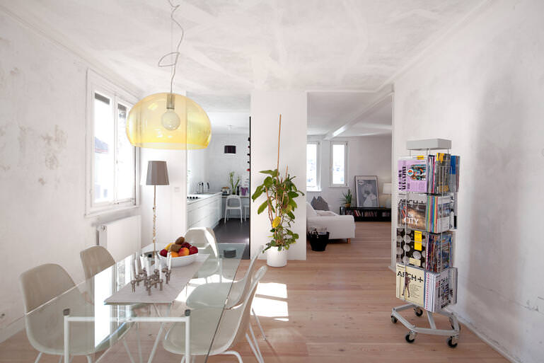 Als Reminiszenz an den Charme vergangener Tage wurden an den Wand- und Deckenoberflächen die historischen Schichten freigelegt und lediglich mit einer feinen weißen, halbtransparenten Lasur überarbeitet. Farbreste der ehemaligen Wandbeschichtungen und unterschiedliche Putzgründe schimmern durch. Man spürt die Vorgeschichte der ehemaligen Dienstbotenzimmer. Auch die Spuren der Eingriffe bleiben überall wie selbstverständlich sichtbar ohne sie gestalterisch zu überhöhen: die Anschlüsse der entfernten Trennwände wurden nur grob ausgespachtelt. Man kann Sie erkennen und so den ehemaligen Grundriss weiterhin ablesen.