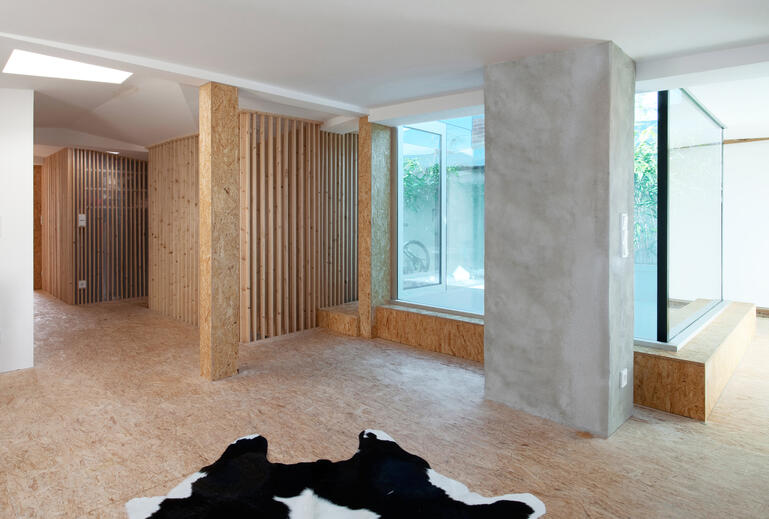 Alt und Neu treten auf unterschiedliche Arten in Dialog miteinander. Historische Elemente bleiben sichtbar erhalten, werden aufgearbeitet, oder an anderer Stelle wiederverwendet. Neue Elemente stellen in Formensprache und Materialität eine klare Referenz an den Altbau dar wie der Einbau aus feinen Holzlamellen, der an die Lattenverschläge erinnert und jetzt als kontinuierliches Raumelement die Treppe ins obere Geschoss begleitet und sich dort als filterähnlicher Raumabschluss zwischen Stauraum und den offenen Bereichen ausbreitet. Andere Neuerungen hingegen weichen in ihrem Duktus deutlich ab und setzen einzelne klare Kontrastpunkte wie der allseitig vollflächig verspiegelte Dacheinschnitt oder sie tragen das Potential neuer Geschichte in sich wie der Waschtisch aus unbehandeltem, massivem Messingblech, der schon bald seine eigene Patina ansetzen wird.