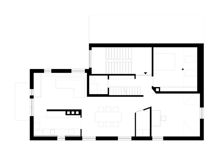 Der äußerst kleinteilig untergliederte Bestandsgrundriss bot scheinbar keine gute Basis für großzügige, lichtdurchflutete Räume. Dennoch war das erklärte Ziel, neben der technischen und baukonstruktiven Sanierung, ein fließendes Raumkontinuum mit unterschiedlichen halboffenen Bereichen und einem Minimum an “klassischen” abgeschlossenen Zimmern zu schaffen, um die gesamte Tiefe des Gebäudes und die unterschiedlichen Außenbezüge vielfältig erlebbar zu machen. Das Konzept eines offenen Raumgefüges setzt sich auch beim Ausbau des Dachstuhls weiter fort. Hier wird ein von außen nicht einsehbarer Dacheinschnitt zum zentralen räumlichen Element. Er öffnet den Raum zum Himmel und sorgt für die großzügige Belichtung des oberen Geschosses ohne den bauzeitlichen Charakter des Gebäude in seiner äußeren Erscheinung zu