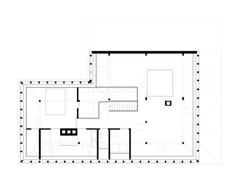 Ausbau der Dachgeschosse eines denkmalgeschützten Gründerzeithauses im Stuttgarter Westen - Durch das Aufbrechen der historischen Grundrissstrukturen entstehen großzügige fließende Räume. Verschiedene Motive des Bestands werden aufgegriffen und neu interpretiert, andere Versatzstücke bleiben sichtbar. Die Räume erzählen ihre Geschichte, die Eingriffe knüpfen hier an und schreiben diese Geschichte fort.