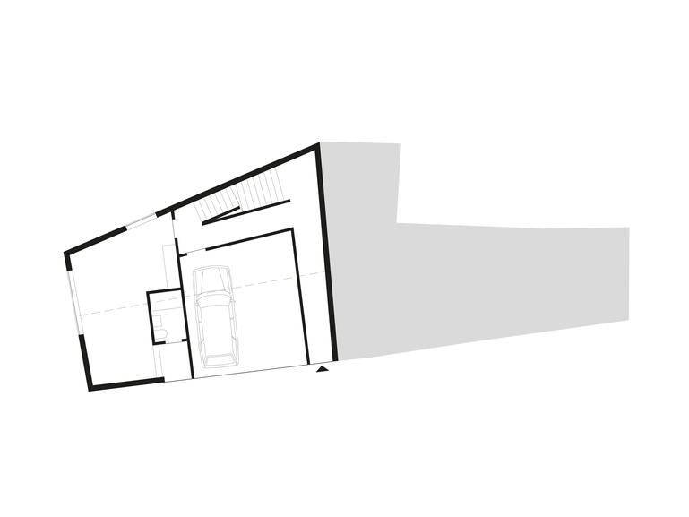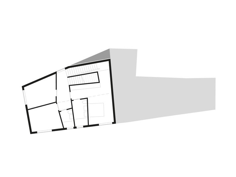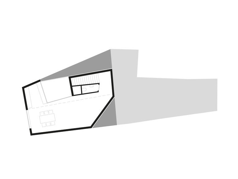 Im Erdgeschoss findet neben dem Zugangsbereich und der Garage eine Einliegerwohnung platz, ein kleiner, gut nutzbarer Garten bleibt bestehen. Der Eingangsflur mit Garderobe durchmisst die gesamte Tiefe bis zur Gartenseite, von dort führt eine Treppe nach oben zu Schlaf- und Kinderzimmern im ersten Stock. Über eine weitere Treppe wechselt man die Richtung und erreicht den großzügigen, offenen Wohnbereich im obersten Geschoss. Eine Dachterrasse ist in das Volumen eingeschnitten, von hier bietet sich ein weiter Ausblick über den Ort bis ins Remstal. Sie sorgt zudem für eine großzügige Belichtung des Wohnraums und der offenen Küche. Ansonsten geben nur wenige großflächige Öffnungen einen gerahmten Blick nach außen frei.